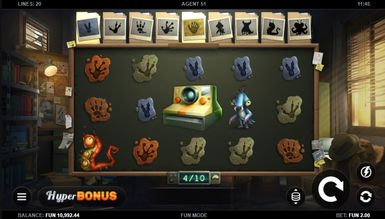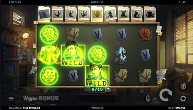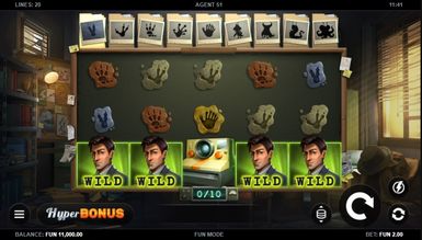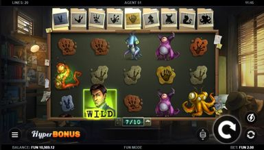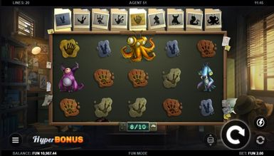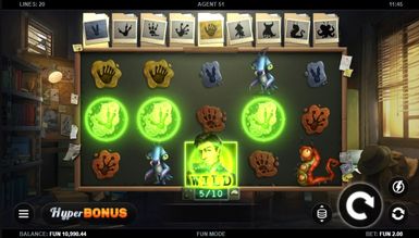 Дія в демо слоті Agent 51 відбувається у темному офісі, десь у таємничій Зоні 51. Сітка 5x3 зі слідів прибульців та дивних істот обертається, з фотографіями Polaroid над кожним символом, збудованим у лінію вгорі. Діапазон ставок від 0,50 до 50,00 монети на спін. HyperBet відразу розблокують бонусний раунд фріспінів. 8, 10 або 12 безкоштовних спінів коштують 45,36, 63,92 або 85,3 більше за ставку. Це гра з 20 лініями, і ця таблиця ліній виплат показує, у скільки разів загальну ставку буде збільшено: