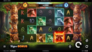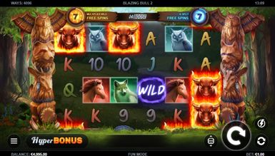 Ігровий автомат Палаючий Бик онлайн включає Дикі, представлені вогняними колами різного кольору та числовими позначеннями. Вайлди замінюють усі картки, окрім піктограм бонусу. Останній запускає режими фріспінів та виплачує до 50 разів більше ставки. Крім заміни значків, всі Wild можуть з'являтися з тегами x2, x3, x5 або x8 під час фрі-ігор з множником. Під час основного раунду накопичуються фріспіни. Кожні 15 і 30 завершених спінів збільшують множник Wild і безкоштовні сесії K-Split на +1. Максимальна кількість початкових безкоштовних ігор для кожного лічильника дорівнює 20. Коли запускаються бонусні, процес представляє бонус-раунди відповідно до цього лічильника. Три або більше бонусних одного виду під час базового раунду запускають відповідний варіант гри. Під час безкоштовних обертань два або більше бонус-символів дають до 15 додаткових ігор. Відсоток повернення вкладень в апараті становить 96,26%.