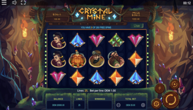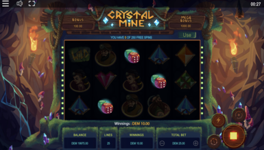 П'ять котушок із 25 смугами в слоті Crystal Mine розташовані на тлі входу в шахту, з боків горять смолоскипи. Розмір ставки у слот-машині варіюється в діапазоні від двох до 25 кредитів за спін. Передбачено бонусний раунд, щоб його запустити, потрібно зібрати три малюнки з кістками. Після чого на дисплеї з'явиться гном, який їх кидатиме. Це залежить від розміру призових виплат. В ігровий автомат Crystal Mine можна грати з мобільного, що дозволяє розважатися у будь-якому зручному місці. Завантаживши на телефон його, гемблер забезпечить себе цікавим та прибутковим дозвіллям, навіть у дорозі.