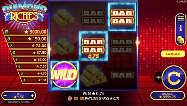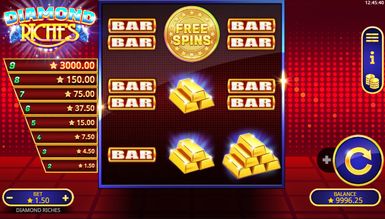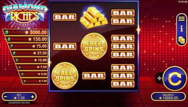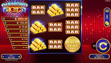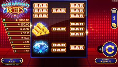Слот Diamond Riches демо представлений 3 барабанами, які складаються з трьох рядів. Вони почнуть рухатися з того моменту, як гравець натисне кнопку із золотим покажчиком. У нижній частині лівої є розділ ставок, який дозволяє змінити загальну суму на хід. Усього 21 ставка. Максимальна становить 50 монет, а мінімальна — 0,10. Параметри процесу: