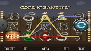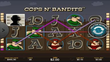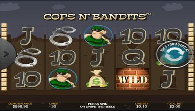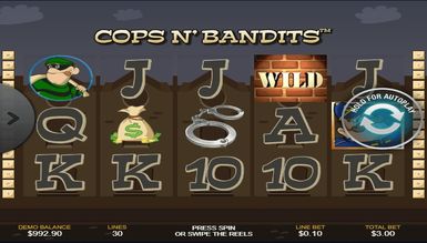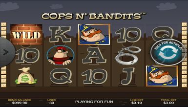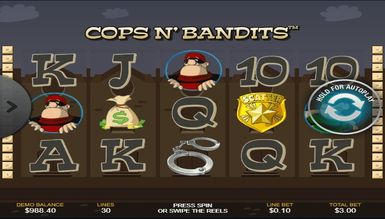 Процес гри на Cops n`Bandits, досить простий, і освоїти його легко зможе навіть новачок, а всі ігрові моменти, на практиці цілком доступні. Cops n` Bandits, пропонує увазі геймерів захоплюючу бонус гру, яка представлена у вигляді пізнання бандитів. Якщо Ви зробили правильний вибір лиходія, отримуєте виграш, а якщо ні, зчитуються бонуси. Реалістичність картинки додає особливої гостроти в процес і не залишає шансів поганому настрою.