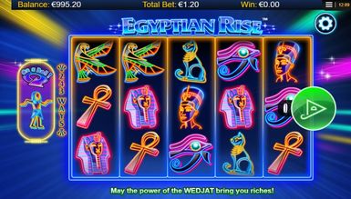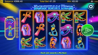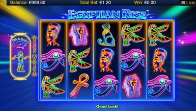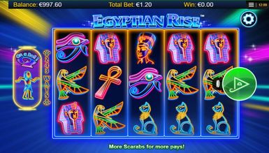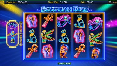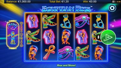 Виконавши це, геймер опиниться на головному екрані гри Egyptian Rise. Перед собою він побачить незвичайне виконання заданої тематики: всі символи гри на п'яти барабанах, розміщених посередині екрана, намальовані лише контурами. При цьому всі вони дуже яскраві та виглядають як неонові. Усі елементи гри мають чітке відношення до заданої теми. Також увагу граючого привертає фон гри. Він не наляпистий і не несе жодної особливої історії в собі, тим не відволікаю геймера. На задньому фоні видніються різнобарвні промені від неонових прожекторів, що виходять із середини поля. З боків від барабанів знаходиться напис, що вказує на кількість гральних ліній, а саме 243. З лівого боку розташувався лічильник, необхідний для отримання призових нагород та бонусних можливостей. Над полем гри розташувався логотип Egyptian Rise. А ось під барабанами гравцю зустрінеться кілька клавіш та інформаційних вікон. Все це служить для швидкого доступу до необхідної інформації про гру та зручне управління.