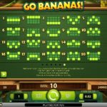 Ігровий слот Go Bananas складається з п'яти барабанів і 20 активних ліній, всі з яких за замовчуванням задіяні в грі. Слід зазначити, що гра підходить досить широкому колу гравців, оскільки мінімальна ставка становить лише один кредит, що робить відеослот доступним практично для будь-якої категорії користувачів. Ігрових символів у грі десять, тож призові комбінації випадають досить часто. Крім основних виплат, описаних у спеціальній таблиці, до ваших послуг дикий символ, який допоможе побудувати виграшну комбінацію шляхом заміни інших зображень. До речі, згадатиме і той факт, що дикий символ, яким у грі виступає зображення банана, випадає на екрані дуже часто.