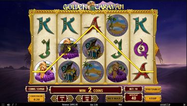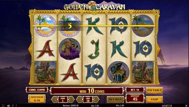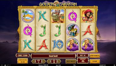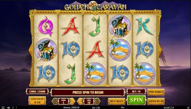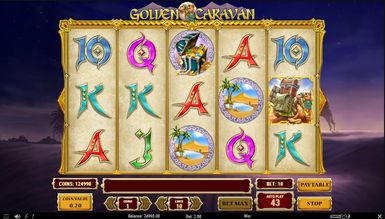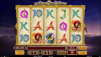 Ігровий автомат Golden Caravan від Play'n GO — це розважальний відеослот з безліччю доповнень та опцій. Основна гра має п'ять барабанів та десять ліній, які можна виставити за допомогою повзунка Lines внизу екрана. Мінімальна ставка на лінію становить одну монету, максимальна – п'ять. Відповідно, можна зіграти на п'ятдесят монет, якщо виставити найвищі показники в грі. Зробити це можна, натиснувши Bet Max. Обертання запускає кнопка Spin або Autospin, залежно від того, ручний або автоматичний режим вибирається гравцем. Символіка тематична — багаті власники караванів, скарби, верблюди та всіма відомі карткові символи, зображені у східному стилі.