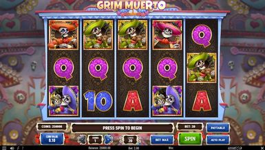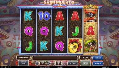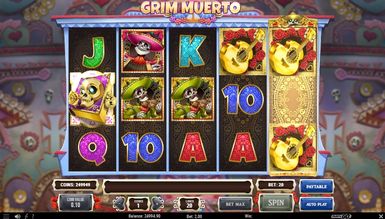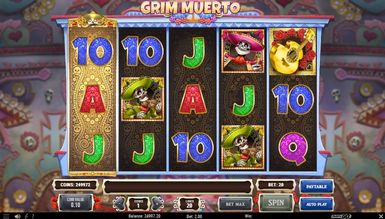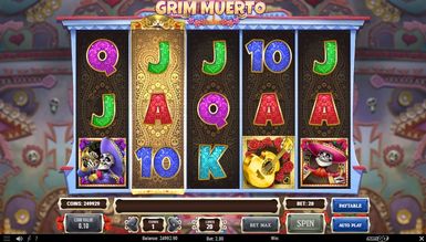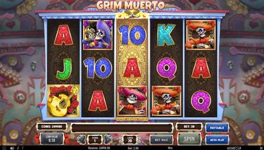 Ігровий автомат Grim Muerto — розважальний відеослот, який радує шанувальників величезною кількістю бонусів. Основна гра складається з п'яти барабанів та двадцяти ліній виплат, регулювати які гравець може за допомогою повзунка Lines. Поруч розташована опція Coins, що дозволяє зробити ставку. Мінімальна ставка на одну лінію — одна монета, максимальна — п'ять. Відповідно, на всі 20 ліній можна поставити 100 монет. Bet Max прискорює цей процес і одразу виставляє найвищі показники у грі. Запустити прокручування можна кнопкою Spin, а натиснувши Autospin, гемблер вибирає автоматичний режим обертання. У вкладці Paytable докладно описується хід гри, спеціальні символи та можливості, а також таблиця множників. Дуже зручно, особливо для тих, хто прийшов зіграти вперше. Символіка основної гри різноманітна — чотири музиканти з оркестру Маріачі, книга, гітара та традиційні для багатьох слотів карткові символи. Найприбутковішим вважається гітара, зібравши яку у кількості 5 на лінії гравець виграє джекпот. До того ж, гітара тут ще й вайлд-символ, який замінює інші, крім розкиду, для досягнення призової комбінації. Перед кожним прокручуванням можна помітити, що один із квадратів підсвічується. Фішка в тому, що якщо вайлд-символ потрапить на підсвічений квадрат, він розшириться і замінить всі символи собою.