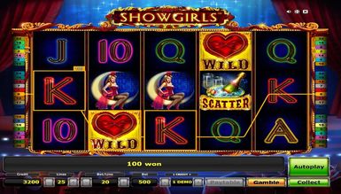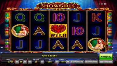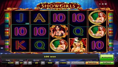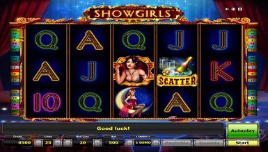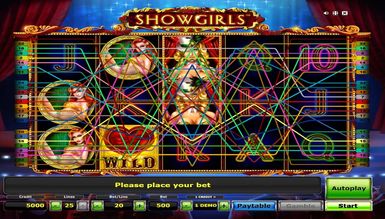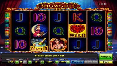 Ігровий емулятор Showgirls складається з п'яти барабанів з 25-ма лініями виплат, на яких трьома рядами розміщуються 11 ігрових символів. Відповідно до заявленої тематики гри в оформленні слота використовуються найяскравіші кольори. Обертання барабанів супроводжуватиметься характерною стилізованою музикою. Головний екран ілюструє затемнену сцену з важкою завісою, на якій і відбувається всі веселощі. Тут ви побачите чотирьох чарівних танцівниць, символи гральних карт A, K, Q, J, 10 та інші картинки, які принесуть вам справжні виграші. Виплата нараховується за комбінацію з трьох і більше однакових символів на тій лінії ліворуч (за винятком тих, що були утворені за допомогою символу розкиду, тобто в будь-якому місці на екрані). Сума виплати залежатиме від самої картинки, її числа і, звичайно, від суми вашої початкової ставки. У ваші шанси придбати таку комбінацію підвищаться, якщо активних (тобто що беруть участь у грі) ліній буде якнайбільше. Також вам надається право на безкоштовні спіни, які ви можете виграти за допомогою символу розкиду, та ризик гри, що дозволяє подвоїти ваші виграні кошти.