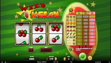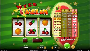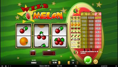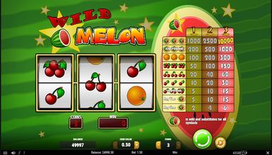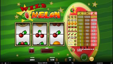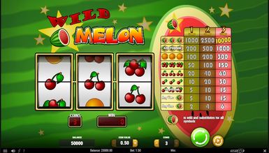 Wild Melon — показовий фруктовий відеослот. Геймплей дуже стриманий — лише за мінімумом, але з високими коефіцієнтами та частотою випадання. Тут лише одна лінія та три барабани, саме такі автомати вважалися прабатьками сучасних. Мінімально можна поставити одну монету, максимально — три. Виплати здійснюються відповідно до таблиці, розташованої праворуч від барабанів. Spin запускає обертання барабанів. Можна вибрати автоматичний режим за допомогою кнопки Autospin. Він крутить барабани до зупинки користувачем. Bet Max одразу виставляє максимальні показники у грі, а кнопка Coins регулює ставку на лінію. Символіка чисто фруктова — різні комбінації вишень, апельсин та кавун. Всі символи, крім кавуна, спрацьовують лише при появі кількості трьох на ігровій лінії. Кавун — особливий символ. По-перше, він виконує функцію вайлда і може зауважити собою будь-який інший, завершивши комбінацію перемогою гемблера. Причому цей фрукт спрацьовує незалежно від лінії — достатньо його появи на ігровому барабані. По-друге, це найприбутковіший символ, який зібрав 3 рази одночасно на лінії, гравець виграє справжній джекпот у розмірі 10 000 монет. Якщо ж зібрати три кавуни не на лінії, але в будь-якому місці поля, виплата також здійсниться. І по-третє, успішною комбінацією вважається навіть один або два кавуни на лінії.