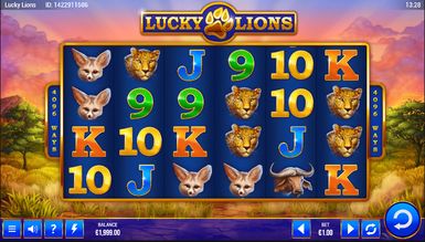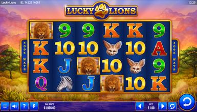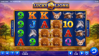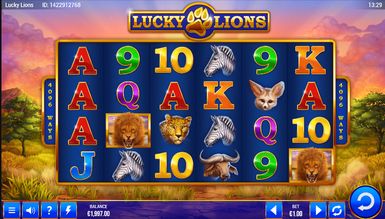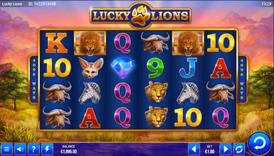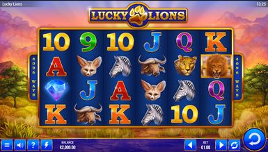 Ігровий автомат Lucky Lions на тему сафарі присвячений царям савани та іншим тваринам. Є раунд безкоштовних обертань із множниками. Шість барабанів розташовані у п'ять рядів. Це не звичайний формат слота з 4096 способами збору призових та раунд фрі обертань, який може запропонувати до 100 прокруток без оплати.