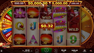 Ігровий автомат Танцюрист Місяця онлайн оплачує комбінації, якщо в них містяться три і більше однакових картинки. Золота прикраса дарує до 6x вкладень, Лотос/Обруч/Ліхтар — до 3х, A, J, K та Q — до 1x. Що справді відрізняє апарат від інших, то це його особливості. Розкид колеса золотого кольору заповнюючи від 5 позицій включає колесо, яке обертається, доки покажчик не зупиниться на певному сегменті. Гравці отримають будь-який множник, наданий цьому сегменту. У раунді "Колесо огляду" також можна активувати функцію фріспінів, якщо покажчик потрапить на сегмент "Free Game". Це дає можливість виграти більше призів за тією самою ставкою. Крім того, у раунді фрі-прокруток з'явиться Скаттер у вигляді пагоди.