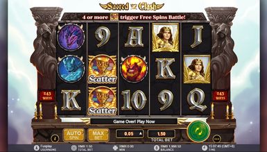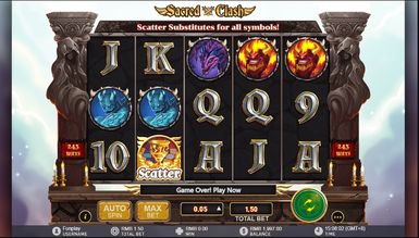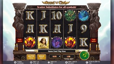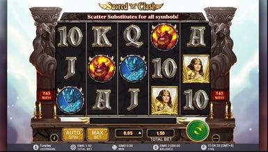 Погоня за прибутком у слоті Sacred Clash пройде на п'яти котушках із 243 активними лініями для формування призових ланцюжків. На кін у слот-автоматі приймається ставка від 15 до 450 кредитів за спин. У слот-машині бонусний раунд та ризик тур не передбачені. Швидше запустіть ігровий автомат Sacred Clash і насолодіться азартним відпочинком.
