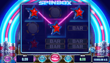 Демо слот Spinbox оформлений яскраво для однорукого бандита. Це не просто класика. Більше стилізація нагадує 7-80, коли неон був мега-популярним. Деякі елементи в оформленні можна порівняти з фільмом Трон. На екрані представлено три барабани з трьома відкритими осередками. Ставка починається з 0,9 монет і максимально може становити на спин 45 монет. Чим вище вкладення, тим щедрішим виявиться виграш. Ліній для оплати передбачено 9. Призи при найбільшій ставці на картинки такі: